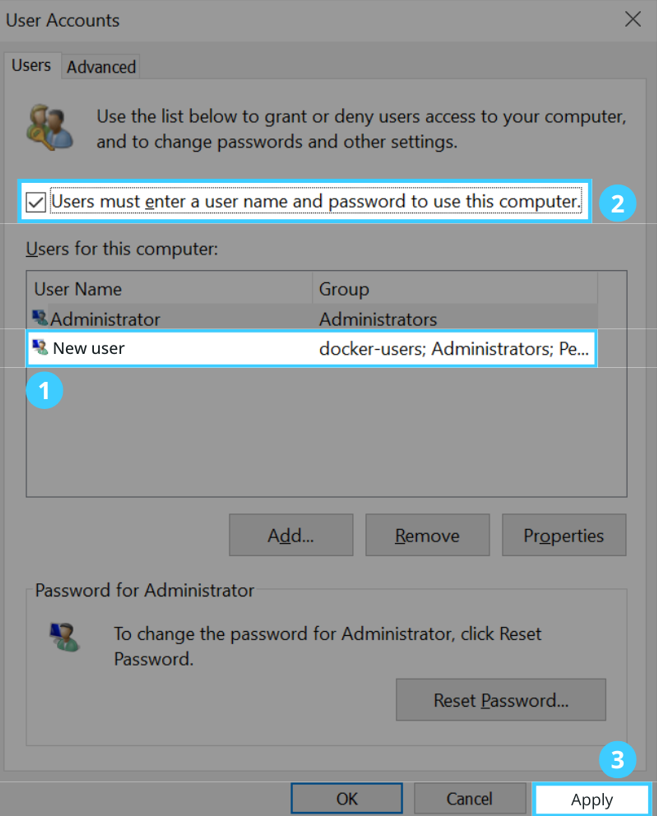 Step 2: On the “User Accounts” window, select the user account and check the option for “Users must enter a username and password to use this computer” and then click Apply.